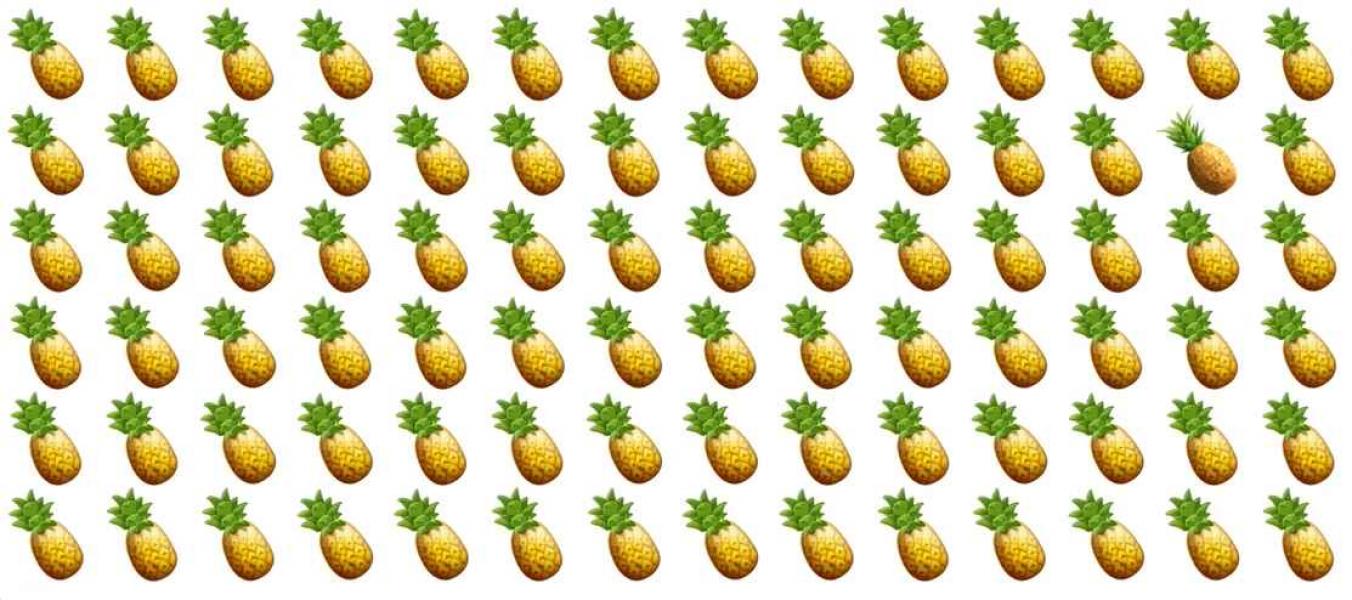 Los een eenvoudige, maar zeer lastige puzzel op – je moet een speciale ananas vinden, die anders is dan alle ananassen die je in de afbeelding ziet.