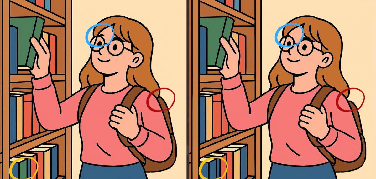 Ben je klaar voor de volgende uitdaging? Bekijk twee afbeeldingen van een meisje dat boeken uitzoekt in een bibliotheek. Ze zien er op het eerste gezicht hetzelfde uit, maar er zijn 3 kleine verschillen. Denk je dat je ze allemaal kunt vinden in 19 seconden? Probeer het en test je visuele scherpte!