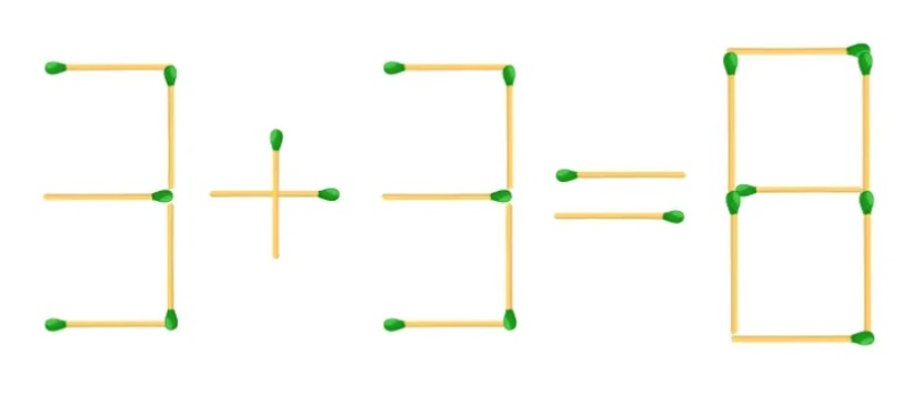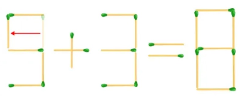 Het geheim is om de vorm van de getallen te veranderen: verplaats gewoon een lucifer zodat een van de “drieën” in een “vijf” verandert. Daarna klopt het voorbeeld helemaal – 5+3=8.