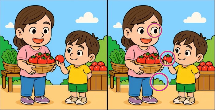 Ben je klaar voor de volgende uitdaging? Kijk eens goed naar de twee afbeeldingen van een moeder en zoon die tomaten plukken. Op het eerste gezicht zien ze er misschien hetzelfde uit, maar er zijn 3 kleine verschillen. Denk je dat je ze allemaal kunt vinden in 45 seconden? Probeer het en test je visuele scherpte!
