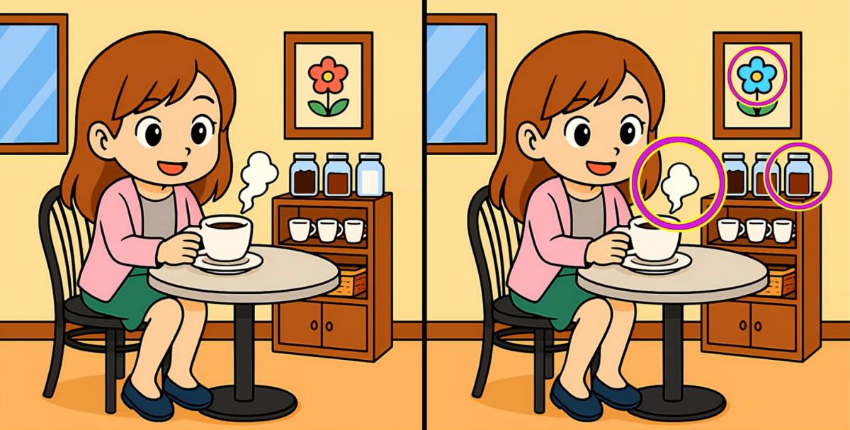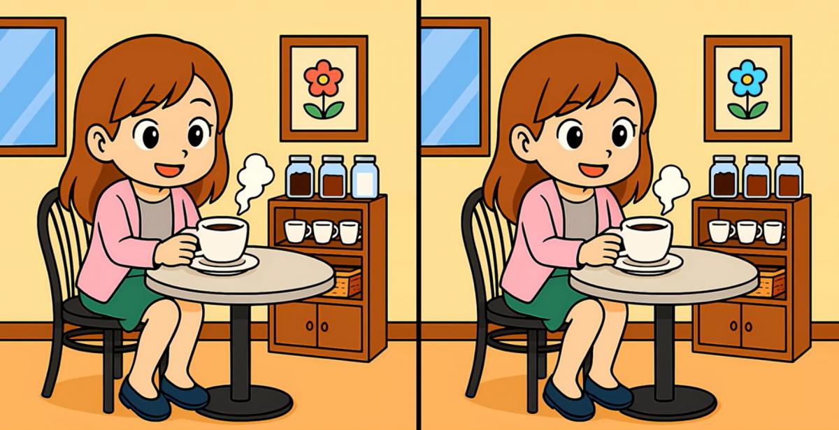 Ben je klaar voor de volgende opdracht? Kijk eens goed naar twee afbeeldingen van een meisje dat koffie drinkt. Op het eerste gezicht lijken ze identiek, maar er zijn 3 kleine verschillen. Denk je dat je ze allemaal kunt vinden in 19 seconden? Probeer het en test je visuele scherpte!
