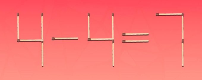 Hieronder zie je een afbeelding waarin de gelijkheid 4-4=7 wordt uitgelegd met behulp van lucifers. Hier zit duidelijk een fout, want het antwoord zou 0 moeten zijn.
